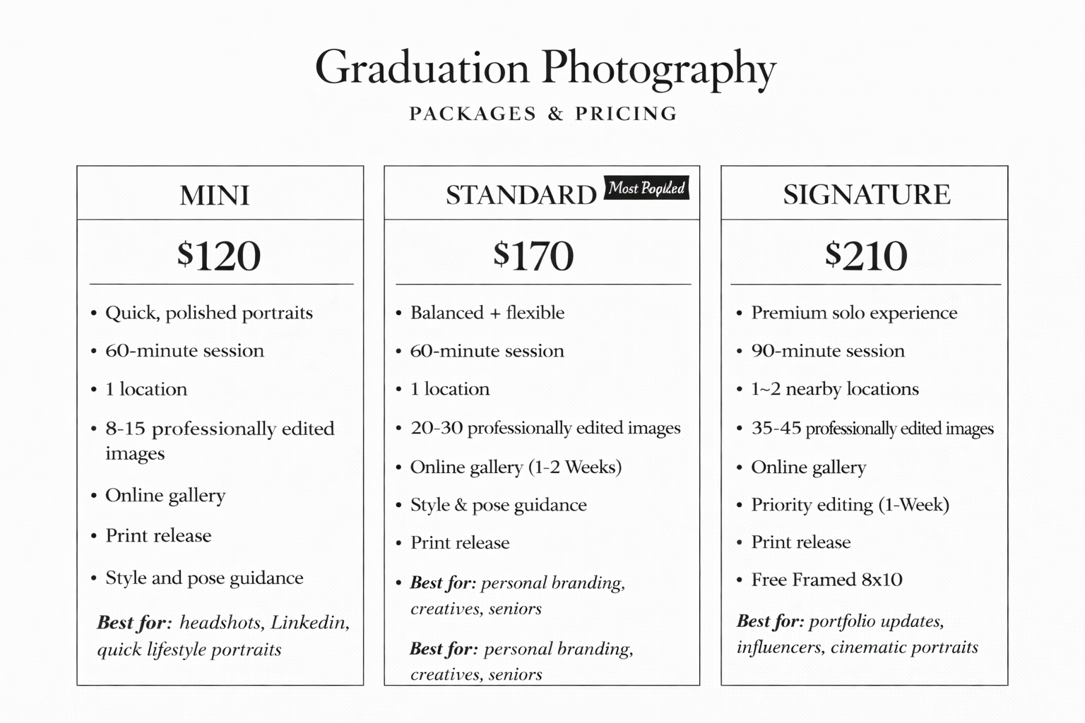 Your graduation is more than a milestone—it’s the start of your next chapter. Celebrate your achievement with timeless portraits that capture your pride, joy, and the excitement of what’s ahead. Packages start at $120, with travel available upon request.